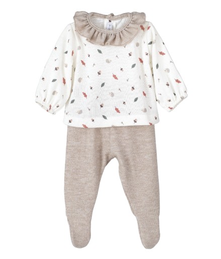 This adorable baby set includes a gaiter and a doublet with print with autumn leaves, with a delicate ruffle at the neck which combines perfectly with the leggings, providing style and freshness.